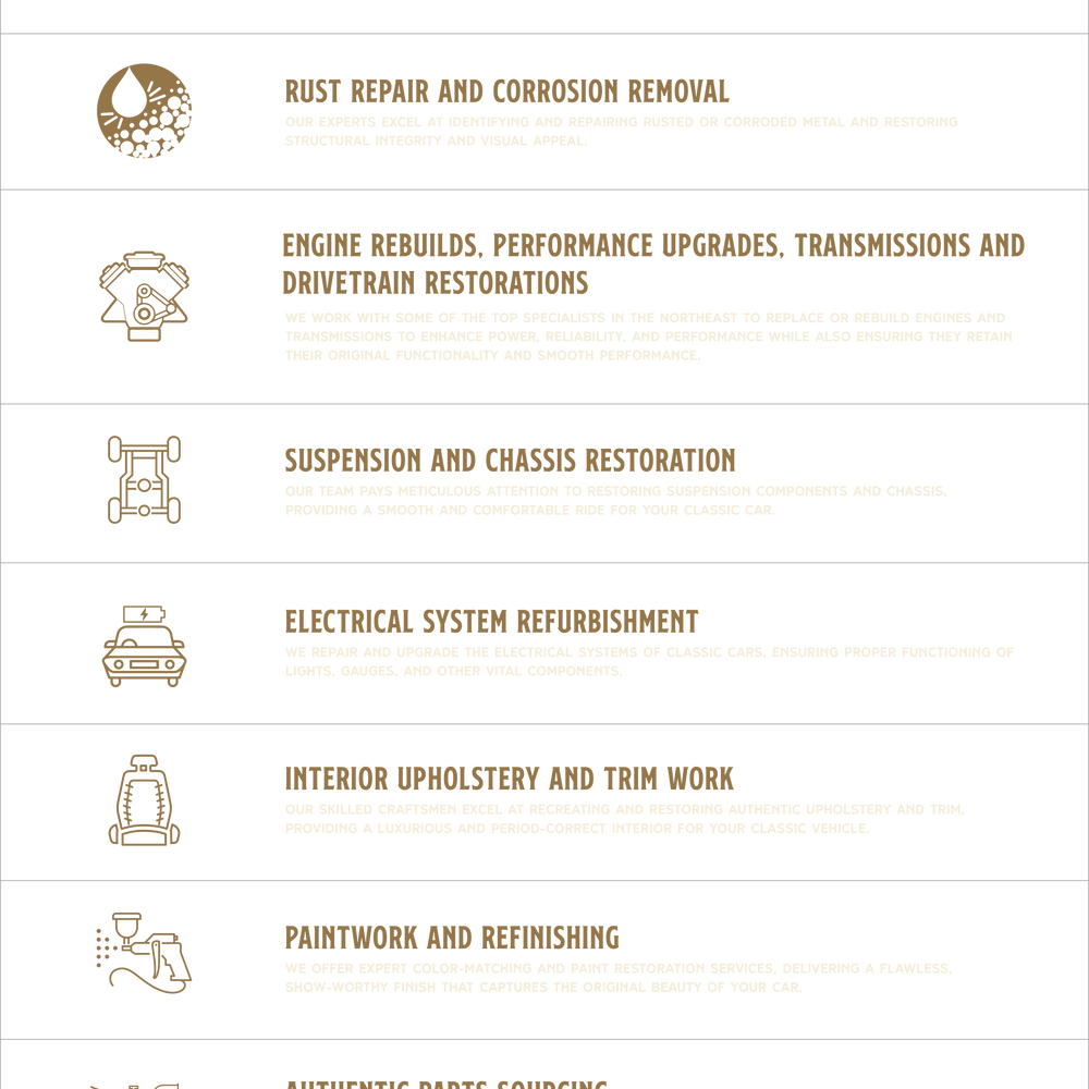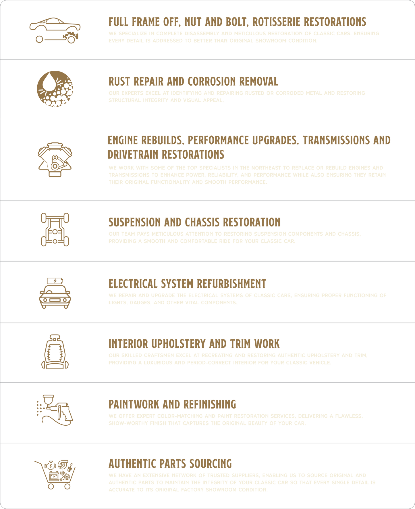 Our team is well known for producing award-winning restorations and we focus on more than just the monetary value of a perfectly restored car, we also care about the sentimental value and historical significance of classic cars. Our commitment to excellence and attention to detail ensure that your restoration project will be completed to show worthy, Concours-level standards.